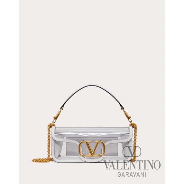 Valentino Garavani Locò shoulder bag in transparent polymeric material with leather trim and metallic VLogo Signature detail.