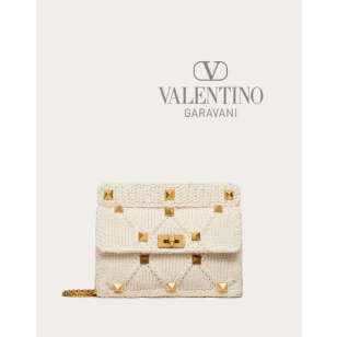 Large Valentino Garavani Roman Stud knitted bag with a rhombus pattern, embellished with hammered-effect maxi studs. Equipped with a detachable handle and detachable sliding chain strap, this accessory can be worn as a crossbody/shoulder bag or carried by hand.