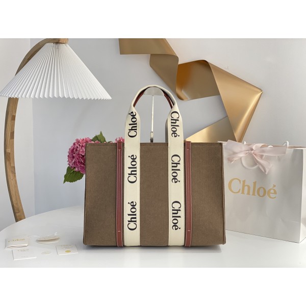 Discount Chloé Large Woody Linen Tote Brown