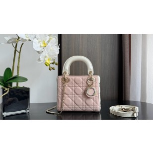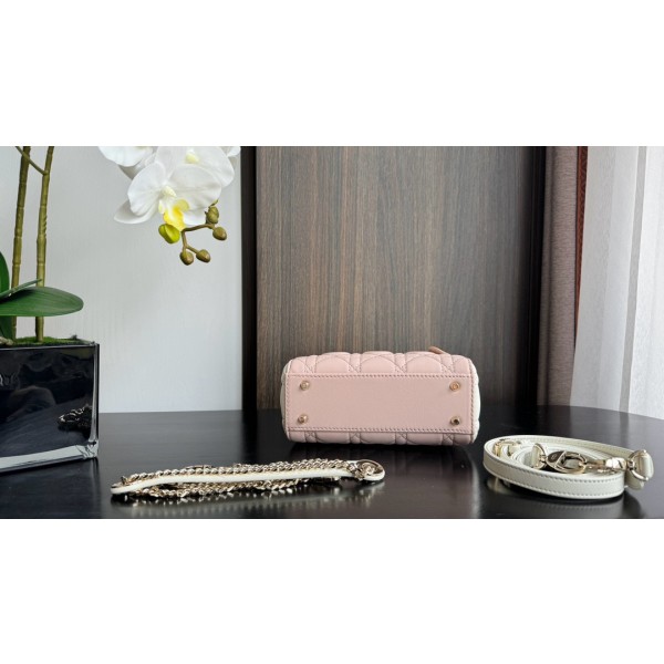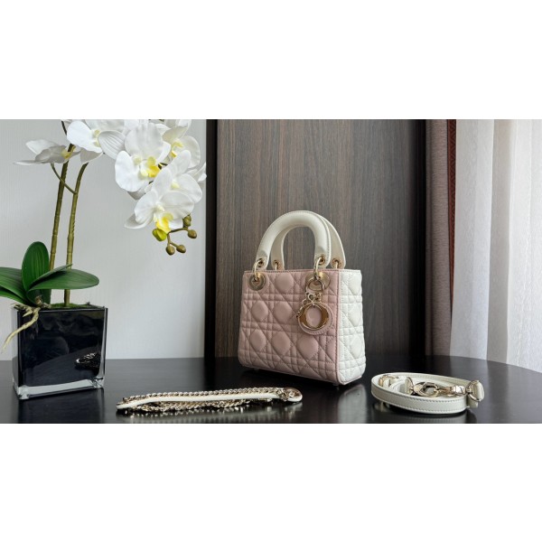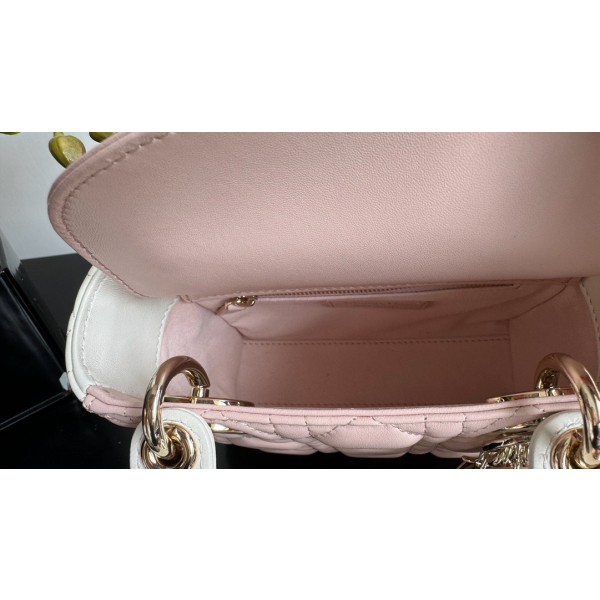 Dior Mini Lady Dior Bag Two-Tone Latte and Powder Pink Cannage Lambskin is crafted in two-tone latte and powder pink lambskin with Cannage stitching, creating the instantly recognizable quilted texture. Pale gold-finish metal D.I.O.R. charms further embellish and illuminate its silhouette.